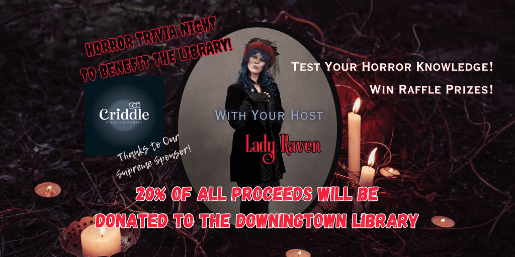 Hold on to your broom, because tickets are flying for the Downingtown Library Horror Trivia Night! Hosted by Lady Raven Prodcutions, this fun night will test your knowledge of all things horror and raise funds for the library.